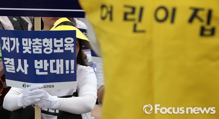 (세종=포커스뉴스) 23일 오전 세종시 정부세종청사 보건복지부 앞에서 충남민간어린이집연합회 회원들이 맞춤형보육 제도개선 및 시행연기 촉구 결의대회를 열고 있다.