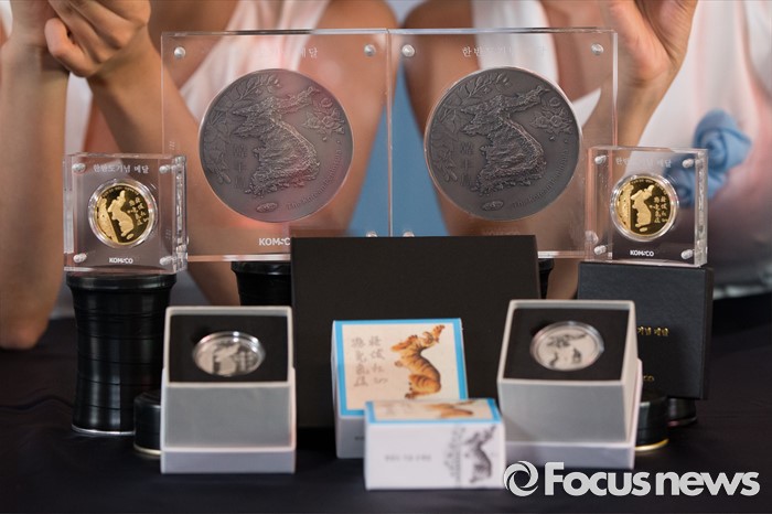 (서울=포커스뉴스) 23일 오전 서울 용산구 전쟁기념관에서 모델들이 한국조폐공사가 6.25전쟁 66주년을 맞아 출시한 '한반도 기념메달'을 들고 포즈를 취하고 있다.