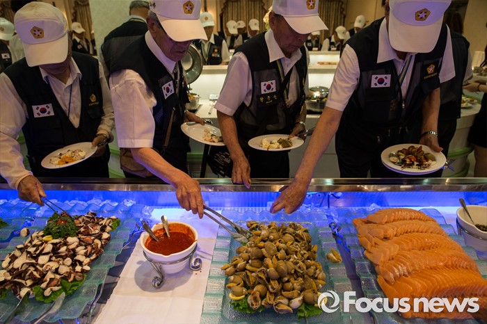 (서울=포커스뉴스) 23일 오전 서울 용산구 전쟁기념관 뮤지엄 웨딩홀에서 참전유공자들이 '6.25전쟁 참전유공자 위로연'에 참석해 식사를 준비하고 있다.