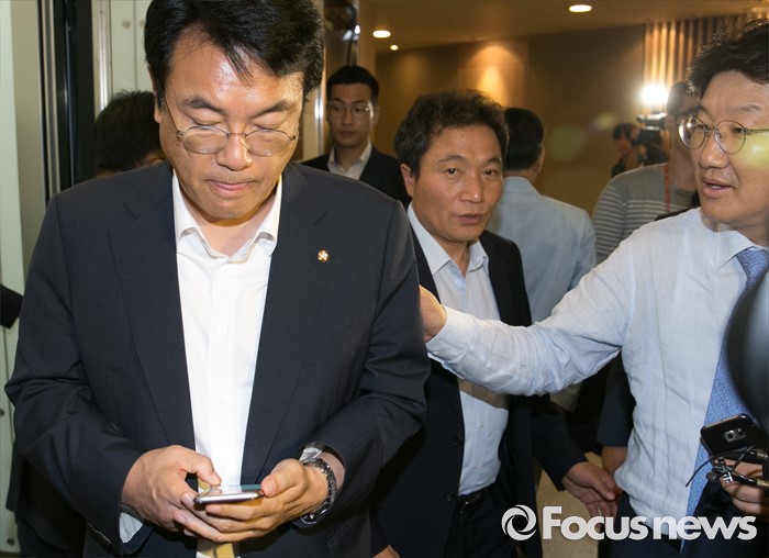 (서울=포커스뉴스) 정진석(왼쪽부터) 새누리당 원내대표, 이학재 비대위원, 사무총장직을 사퇴한 권성동 의원이 23일 오후 서울 여의도 한 음식점에서 진행된 비상대책위원들과의 오찬 모임에 참석하고 있다.
