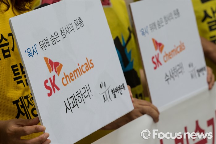 (서울=포커스뉴스) 23일 오후 서울 종로구 SK 본사 앞에서 열린 'SK케미칼 규탄 및 책임자 수사 촉구' 기자회견에서 가습기살균제참사전국네트워크 회원들이 SK케미칼을 규탄하는 손팻말을 들고 있다.