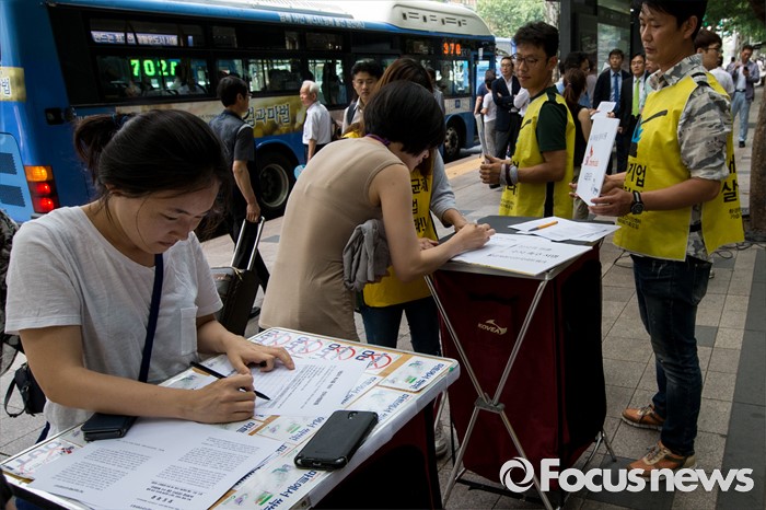 (서울=포커스뉴스) 23일 오후 서울 종로구 SK 본사 앞에서 열린 'SK케미칼 규탄 및 책임자 수사 촉구' 기자회견에서 가습기살균제참사전국네트워크 회원들이 시민들의 서명을 받고 있다.
