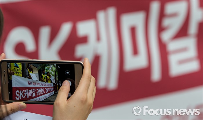 (서울=포커스뉴스) 23일 오후 서울 종로구 SK 본사 앞에서 열린 'SK케미칼 규탄 및 책임자 수사 촉구' 기자회견에서 가습기살균제참사전국네트워크 회원들이 SK케미칼을 규탄하는 대형 펼침막을 들고 있다.