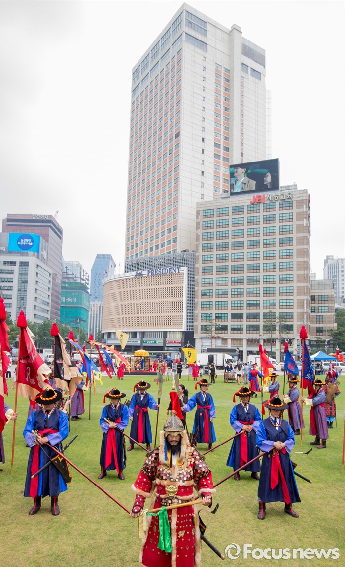 (서울=포커스뉴스) 23일 오후 서울광장에서 열린 '왕궁수문장 20주년 기념행사'에 참석한 관계자들이 대열의식을 재현하고 있다.