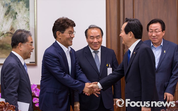 (서울=포커스뉴스) 정세균(오른쪽 두 번째) 국회의장이 23일 오후 서울 여의도 국회에서 이청연(왼쪽 두 번째) 인천시교육감과 면담에 앞서 악수 하고 있다.