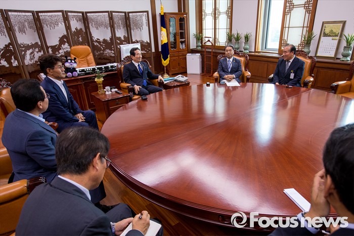 (서울=포커스뉴스) 정세균(가운데) 국회의장이 23일 오후 서울 여의도 국회에서 장휘국 전국시도교육감협의회 회장을 비롯한 교육감들과 면담 하고 있다. 오른쪽부터 장휘국 광주시교육감, 이재정 경기도교육감, 정세균 국회의장, 이청연 인천시교육감, 민병희 강원도교육감.