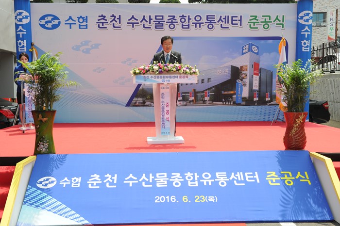 (춘천=포커스뉴스) 김영석 해양수산부장관이 23일 강원도 춘천시 효자동 수산물종합유통센터 준공식에 참석해 축사를 하고 있다. <사진제공=해양수산부>