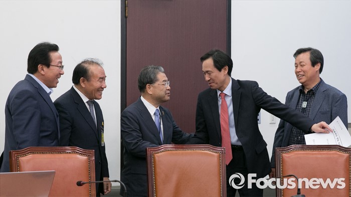 (서울=포커스뉴스) 23일 오후 서울 여의도 국회에서 열린 누리과정 및 지방교육재정 해결 위한 전국시도교육감협의회와 간담회에 참석한 우상호 더불어민주당 원내대표와 이재정 경기도교육감이 인사하고 있다. 왼쪽부터 민병희 강원도교육감, 장휘국 전국시도교육감협의회장(광주시교육감), 이재정 경기도교육감, 우상호 더불어민주당 원내대표, 도종환 교육문화체육관광위원회 간사.