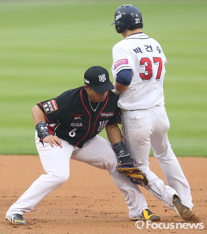 (서울=포커스뉴스) 23일 서울 잠실구장에서 열린 2016 프로야구 kt-두산 경기 1회말 무사 1루에서 두산 오재원의 2루 땅볼때 1루주자 박건우가 2루에서 kt 2루수 박경수에게 태그아웃되고 있다.