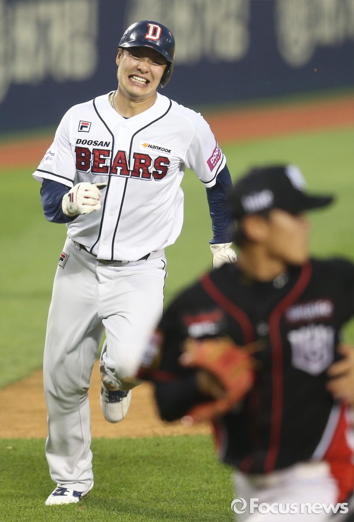 (서울=포커스뉴스) 23일 서울 잠실구장에서 열린 2016 프로야구 kt-두산 경기 4회말 무사 1루에서 두산 1루주자 민병헌이 김재환의 우중간 2루타떄 홈을 향해 전력질주하고 있다.