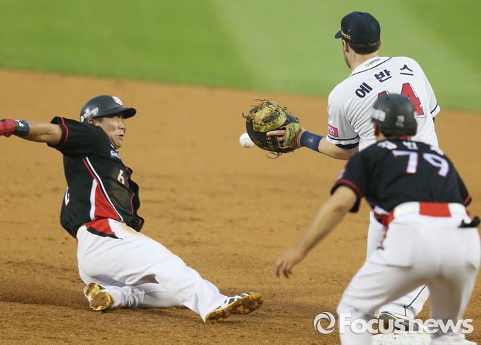 (서울=포커스뉴스) 23일 서울 잠실구장에서 열린 2016 프로야구 kt-두산 경기 3회초 1사 1루에서 kt 전민수의 중견수 플라이 아웃때 1루주자 박경수가 귀루하다 아웃되고 있다.