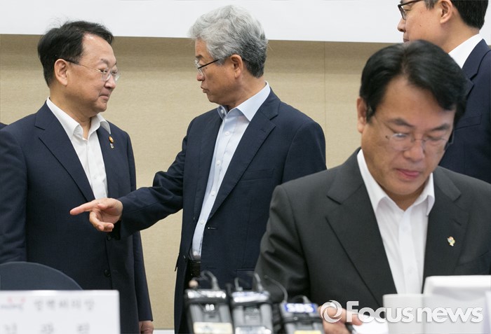 (서울=포커스뉴스) 24일 오전 서울 여의도 국회 귀빈식당에서 열린 2016년 하반기 경제정책방향 당정간담회에 참석한 유일호(왼쪽) 경제부총리 겸 기획재정부 장관과 이철우(가운데) 정보위원장이 대화하고 있다. 오른쪽은 정진석 새누리당 원내대표.