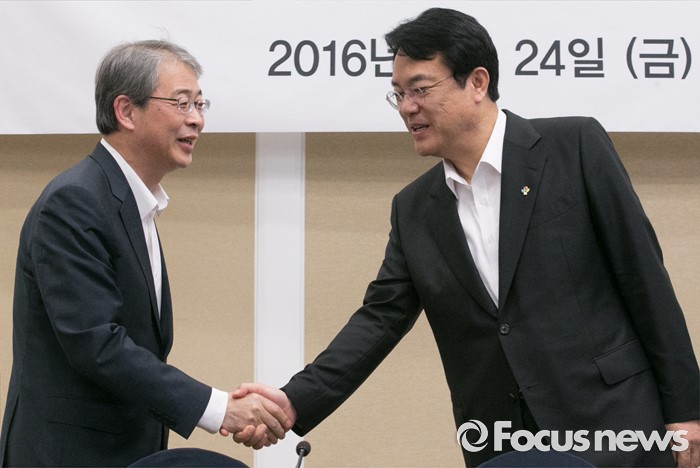 (서울=포커스뉴스) 24일 오전 서울 여의도 국회 귀빈식당에서 열린 2016년 하반기 경제정책방향 당정간담회에 참석한 정진석(오른쪽) 새누리당 원내대표와 임종룡 금융위원장이 악수하고 있다.