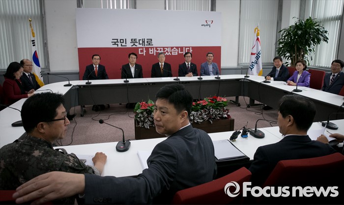 (서울=포커스뉴스) 24일 오전 서울 여의도 국회에서 열린 북한 미사일 발사 관련 국방부 현안보고에 참석한 김희옥 새누리당 혁신비대위원장과 정진석 원내대표 등 의원들이 황인무 국방부 차관 등 관계자들의 보고를 받고 있다.