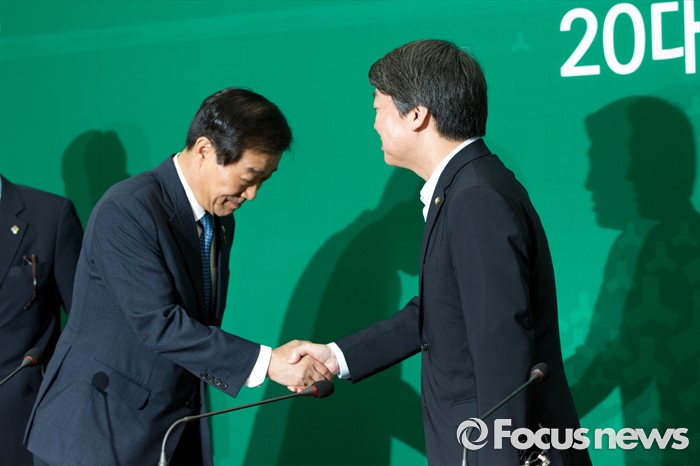 (서울=포커스뉴스) 안철수(오른쪽) 국민의당 상임공동대표가 24일 오전 서울 여의도 국회에서 황인무 국방부 차관에게 북한 미사일 발사 관련 현안보고 받기 전 악수 하고 있다.