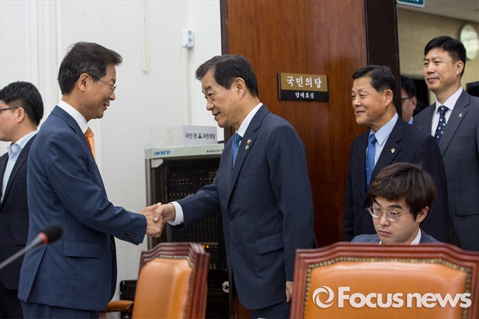 (서울=포커스뉴스) 천정배(왼쪽) 국민의당 공동대표가 24일 오전 서울 여의도 국회에서 황인무(왼쪽 두 번째) 국방부 차관에게 북한 미사일 발사 관련 현안보고 받기 전 악수 하고 있다.