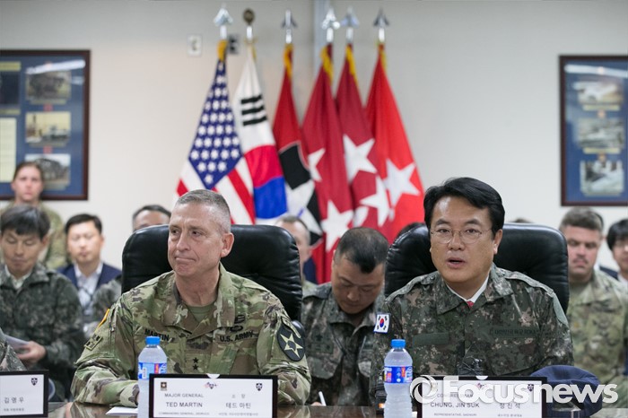 (의정부=포커스뉴스) 정진석 새누리당 원내대표가 24일 오전 경기도 의정부 미2사단 한미연합사단을 방문해 부대 현황보고에 앞서 인사말을 하고 있다. 왼쪽은 테드 마틴 미2사단장.