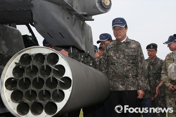 (의정부=포커스뉴스) 정진석 새누리당 원내대표, 김영우 국방위원장 등 의원들이 24일 오전 경기도 의정부 미2사단 한미연합사단을 방문해 부대현황 보고를 받은 뒤 아파치 헬기를 살펴보고 있다.