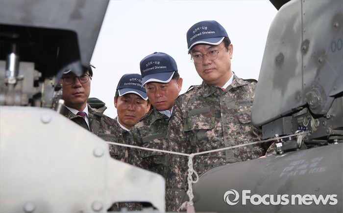 (의정부=포커스뉴스) 정진석 새누리당 원내대표, 김영우 국방위원장 등 의원들이 24일 오전 경기도 의정부 미2사단 한미연합사단을 방문해 부대현황 보고를 받은 뒤 아파치 헬기를 살펴보고 있다.