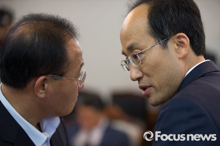 (서울=포커스뉴스) 윤재옥(왼쪽) 새누리당 대구시당 위원장과 추경호 의원이 24일 오후 서울 종로구 정부서울청사에서 영남권 신공항 백지화 관련 황교안 국무총리와 면담 전 대화를 나누고 있다.