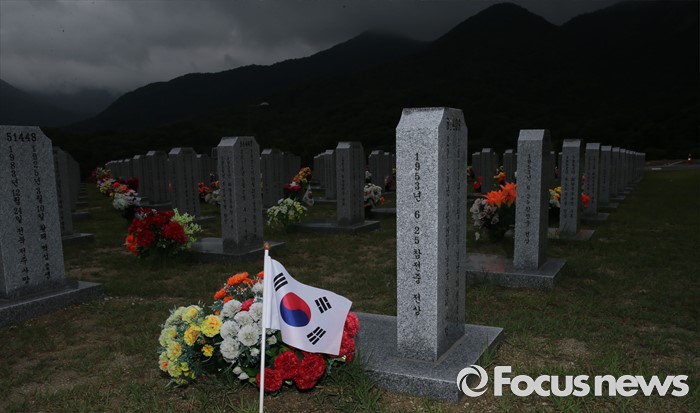 (대전=포커스뉴스) 6·25전쟁 66주년을 하루 앞둔 24일 오후 대전 유성구 국립대전현충원 6.25 전쟁 참전 용사의 묘비 앞에 태극기가 바람에 휘날리고 있다.