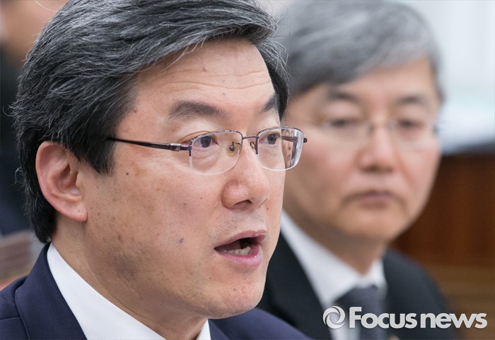 (서울=포커스뉴스) 24일 오후 서울 여의도 국회에서 열린 산업통상자원위원회 전체회의에 참석한 주영섭 중소기업청장이 의원들의 질의에 답하고 있다. 오른쪽은 최동규 특허청장.