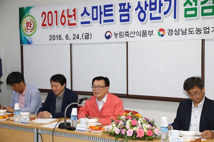 (진주=포커스뉴스) 이동필 농림축산식품부 장관이 24일 경남 진주시 경남도농업기술원 첨단농업에서 열린 스마트 팜 확산 상반기 점검회의에서 스마트 팜 추진성과를 점검하고 현장의 의견을 청취하고 있다. <사진제공=농림축산식품부>