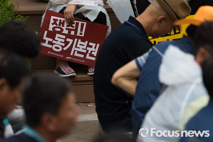 (서울=포커스뉴스) 24일 오후 서울 영등포구 산업은행 앞에서 열린 '성과급제 폐지와 노동기본권 쟁취를 위한 공무원·교사 결의대회'에 참가한 전국교직원노동조합과 전국공무원노동조합 조합원들이 손피켓을 들고 있다.