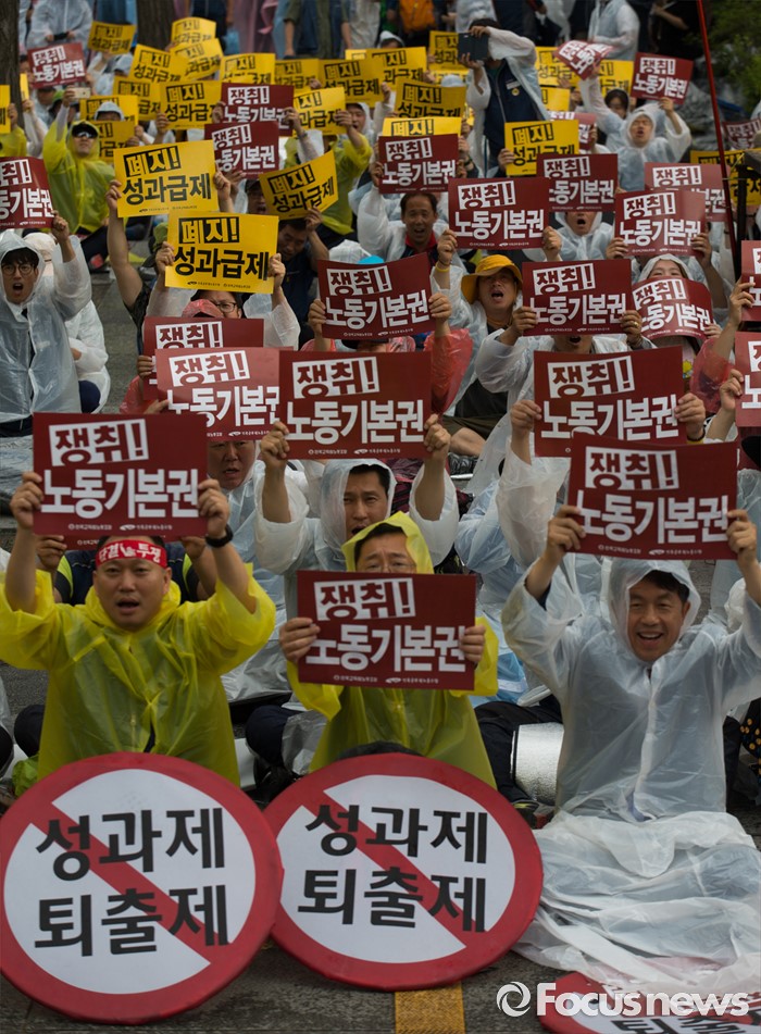 (서울=포커스뉴스) 24일 오후 서울 영등포구 산업은행 앞에서 열린 '성과급제 폐지와 노동기본권 쟁취를 위한 공무원·교사 결의대회'에 참가한 전국교직원노동조합과 전국공무원노동조합 조합원들이 손피켓을 들고 함성을 지르고 있다.