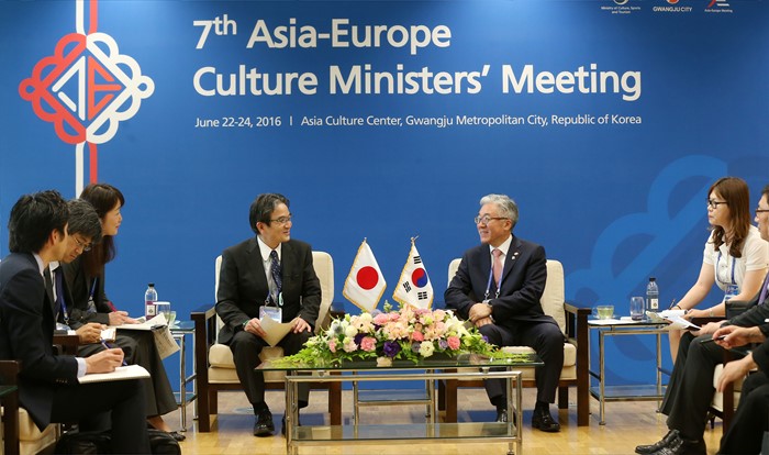 (광주=포커스뉴스) 김종덕 문화체육관광부 장관이 23일 제7차 ASEM 문화장관회의가 열리고 있는 광주시 동구 국립아시아문화전당에서 미야타 료헤이(Ryohei Miyata, 宮田 亮平) 일본 문화청장과 접견을 하고 있다. <사진제공=문화체육관광부>