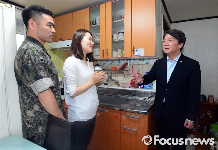 (의정부=포커스뉴스) 안철수(오른쪽) 국민의당 상임공동대표가 24일 오후 경기도 의정부 56사단의 한 부대를 방문해 군인 아파트 현장을 확인하고 박경득 소령 부부를 격려하고 있다.