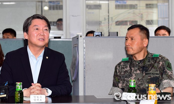 (의정부=포커스뉴스) 안철수 국민의당 상임공동대표가 24일 오후 경기도 의정부 56사단의 한 부대를 방문해 지휘통제실에서 인사말을 하고 있다. 오른쪽은 인성환 사단장.