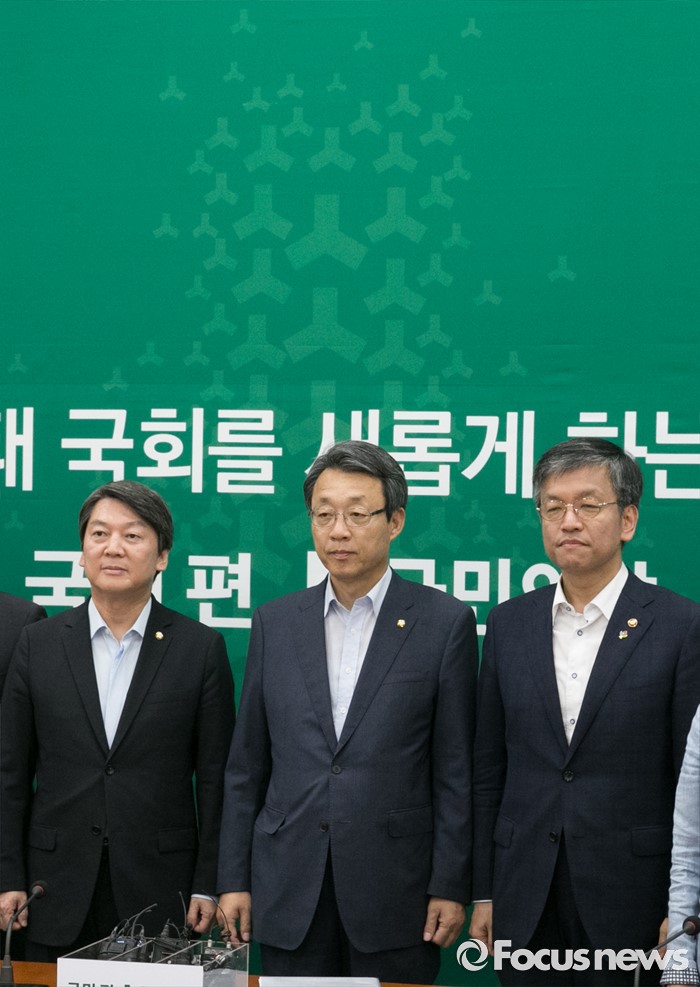 (서울=포커스뉴스) 안철수(왼쪽부터) 국민의당 상임공동대표, 김성식 정책위의장과 최상목 기획재정부 1차관 등 의원들이 24일 오후 서울 여의도 국회에서 브렉시트(Brexit) 대책회의에 앞서 취재진을 향해 포즈를 취하고 있다.