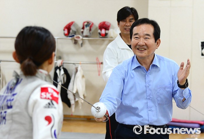 (서울=포커스뉴스) 정세균 국회의장이 24일 오후 서울 노원구 태릉선수촌을 방문해 브라질 리우 올림픽을 앞두고 훈련 중인 남현희 선수와 펜싱 대결을 하고 있다.
