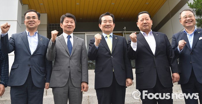 (서울=포커스뉴스) 정세균 국회의장이 24일 오후 서울 노원구 태릉선수촌을 방문해 브라질 리우 올림픽 준비위원회 관계자들과 기념촬영을 하고 있다. 왼쪽부터 김종 문화체육관광부 2차관, 정몽규 올림픽 선수단장, 정 의장, 김정행 대한체육회장, 강영중 대한체육회장.