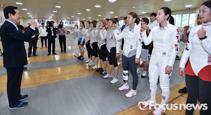 (서울=포커스뉴스) 정세균(왼쪽) 국회의장이 24일 오후 서울 노원구 태릉선수촌을 방문해 브라질 리우 올림픽을 앞두고 훈련 중인 펜싱 국가대표 선수들을 만나 파이팅을 외치고 있다.