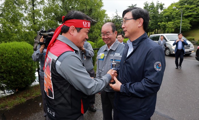 (거제=포커스뉴스) 이기권 고용노동부 장관이 24일 경남 거제 대우조선해양 노사와 간담회를 갖고 업황 부진으로 어려움을 겪는 조선업 종사자 의견을 청취했다. 간담회에 앞서 직원과 악수를 하고 있다. <사진제공=고용노동부>