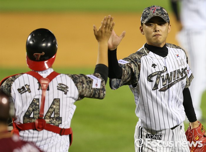 (서울=포커스뉴스) 24일 서울 잠실구장에서 열린 2016 프로야구 넥센-LG 경기에서 LG 마무리 투수 임정우가 승리를 지키고 포수 박재욱과 하이파이브하고 있다.