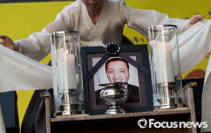 (서울=포커스뉴스) 24일 오후 서울 서초구 현대자동차 본사 앞에서 열린 '유성기업 故 한광호씨 100일ㆍ현대차 진격의 날' 집회에 참석한 서정숙 무용가가 추모공연을 하고 있다.