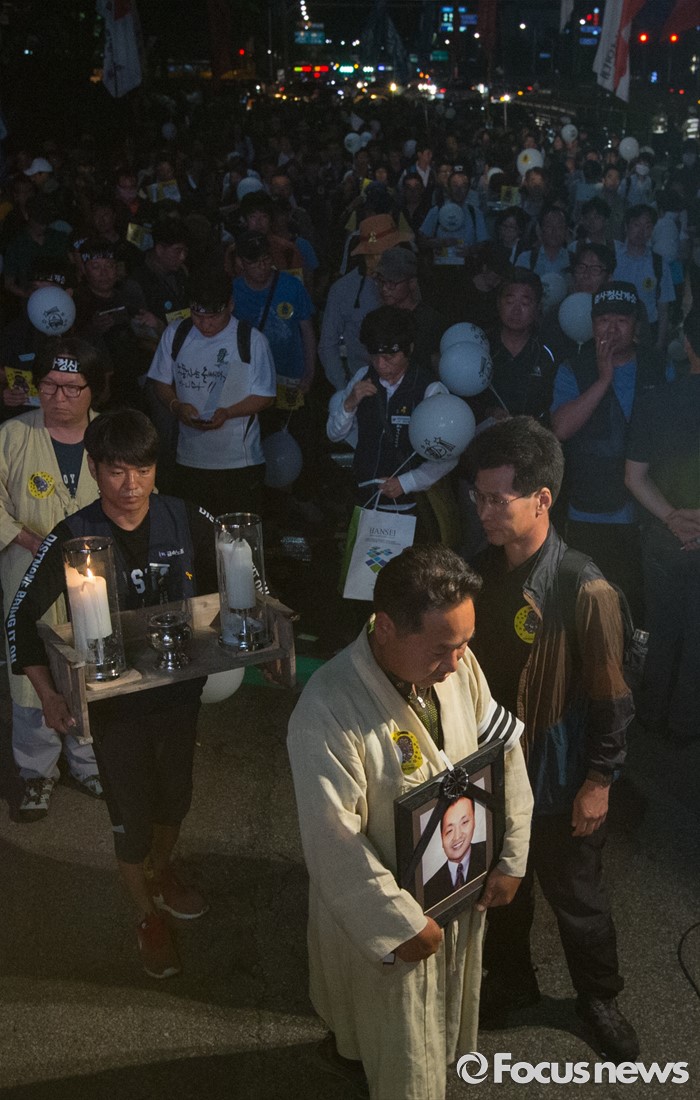(서울=포커스뉴스) 24일 오후 서울 서초구 현대자동차 본사 앞에서 열린 '유성기업 故 한광호씨 100일ㆍ현대차 진격의 날' 집회에 참석한 고인의 형 국석호씨가 영정을 들고 있다.