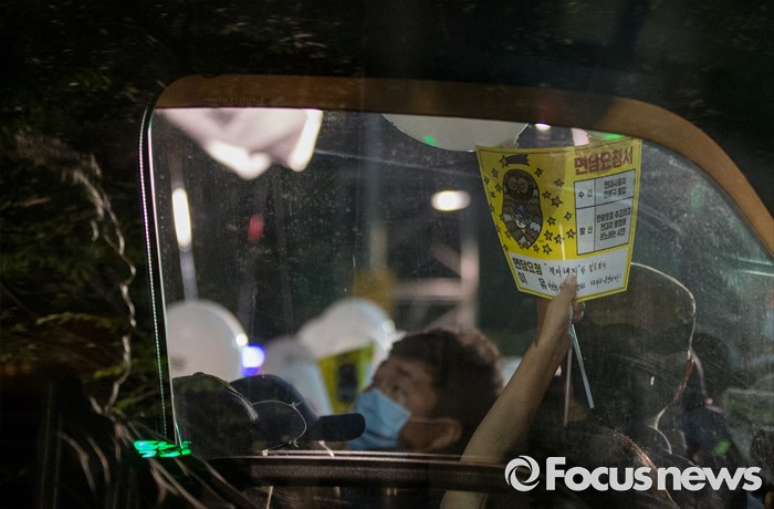 (서울=포커스뉴스) 24일 오후 서울 서초구 현대자동차 본사 앞에서 열린 '유성기업 故 한광호씨 100일ㆍ현대차 진격의 날' 집회에 참석한 한 노동자가 정몽구 현대차회장 면담요청서를 들고 있다.