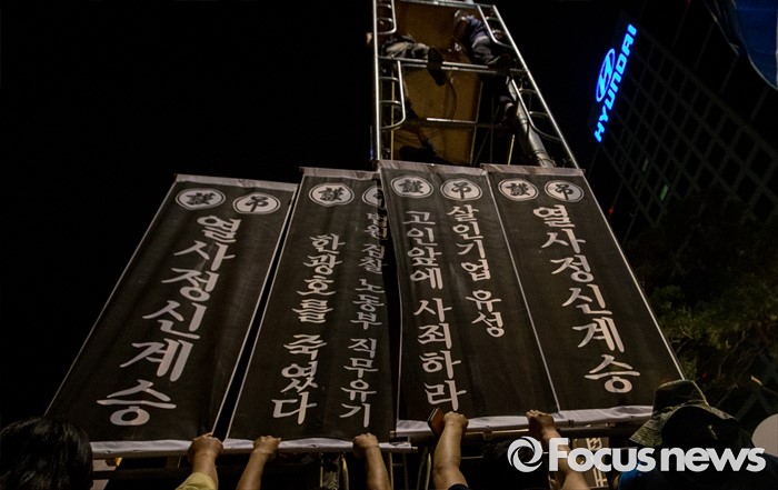 (서울=포커스뉴스) 24일 오후 서울 서초구 현대자동차 본사 앞에서 열린 '유성기업 故 한광호씨 100일ㆍ현대차 진격의 날' 집회에 참석한 노동자들이 고인을 기리는 현수막을 들고 있다.