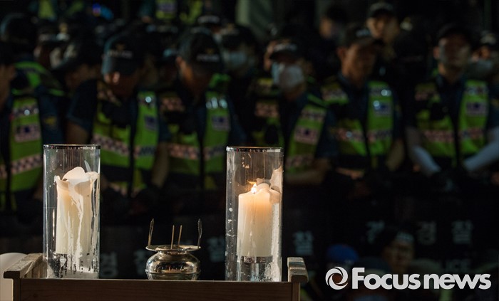 (서울=포커스뉴스) 24일 오후 서울 서초구 현대자동차 본사 앞에서 열린 '유성기업 故 한광호씨 100일ㆍ현대차 진격의 날' 집회에 고인의 추모제단이 놓여 있다.