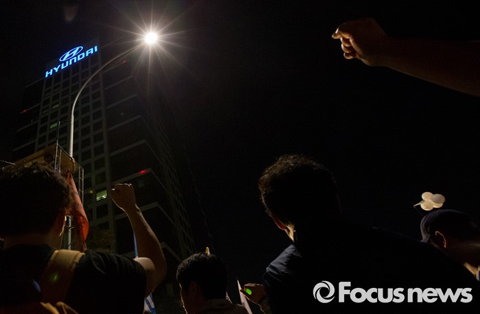 (서울=포커스뉴스) 24일 오후 서울 서초구 현대자동차 본사 앞에서 열린 '유성기업 故 한광호씨 100일ㆍ현대차 진격의 날' 집회에 참석한 노동자들이 구호를 외치고 있다.