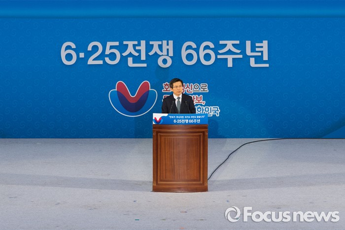 (서울=포커스뉴스) 25일 오전 서울 송파구 잠실실내체육관에서 열린 '6.25전쟁 66주년 기념식'에 참석한 황교안 국무총리가 기념사를 하고 있다.