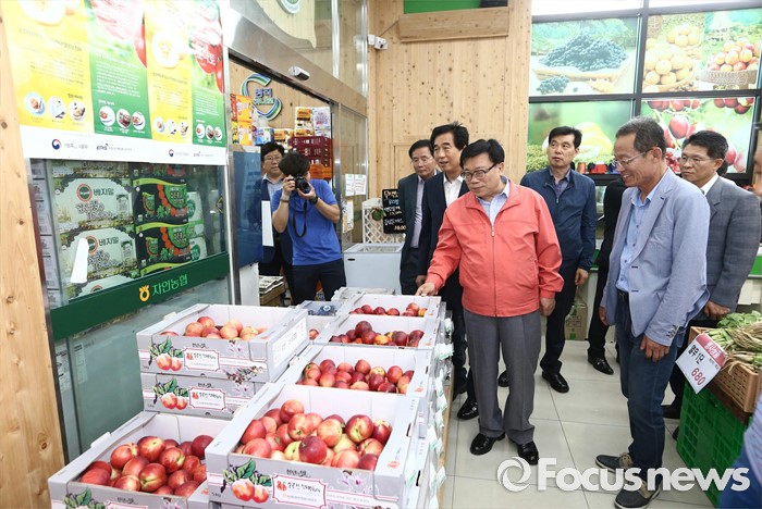 (경산=포커스뉴스) 이동필 농림축산식픔부 장관이 25일 경북 경산시 자인농협농산물산지유통센터현장을 찾아 운영현황을 점검하고 복송아 선별장, 로컬푸드 매장 등을 돌러보고 있다. <사진제공=농림축산식품부>