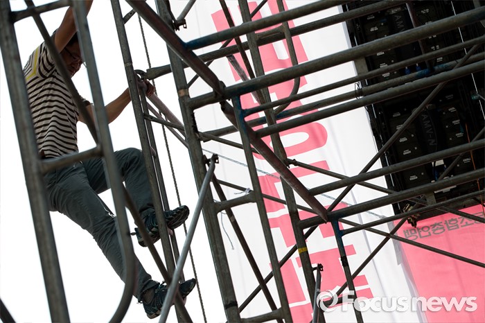 (서울=포커스뉴스) 25일 오후 서울 중구 시청광장에서 열린 '민주노총 전국노동자대회' 한 관계자가 무대를 점검하고 있다.