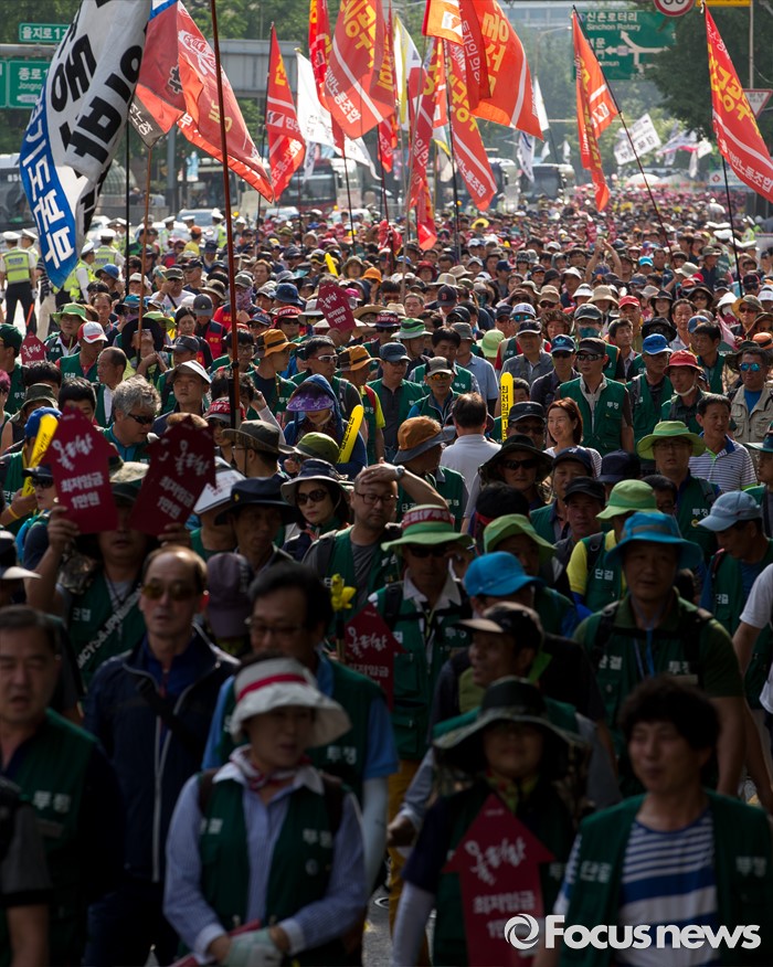 (서울=포커스뉴스) 25일 오후 서울 중구 시청광장에서 열린 '민주노총 전국노동자대회' 참석자들이 최저임금 1만원, 비정규직 철폐를 촉구하며 행진하고 있다.