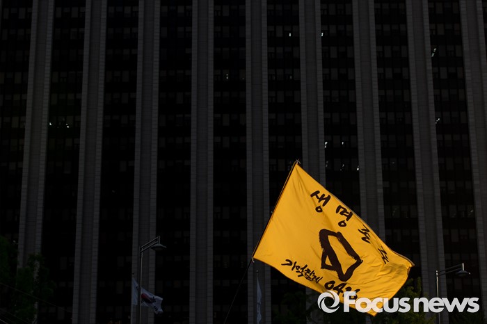 (서울=포커스뉴스) 25일 오후 서울 종로구 광화문광장에서 세월호 가족협의회 및 시민들이 참석한 가운데 '세월호 특별법 개정 촉구 범국민대회'가 열리고 있다. 세월호 특별법 개정 촉구 범국민대회 깃발뒤로 서울정부청사의 모습이 보이고 있다.