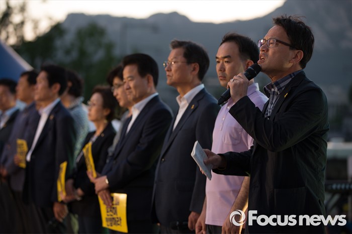 (서울=포커스뉴스) 25일 오후 서울 종로구 광화문광장에서 열린 '세월호 특별법 개정 촉구 범국민문화제'에 참석한 야당 의원들이 발언하고 있다. 오른쪽 네 번째부터 국민의당 정동영 의원, 천정배 공동대표, 채이배 의원, 더불어민주당 박주민 의원